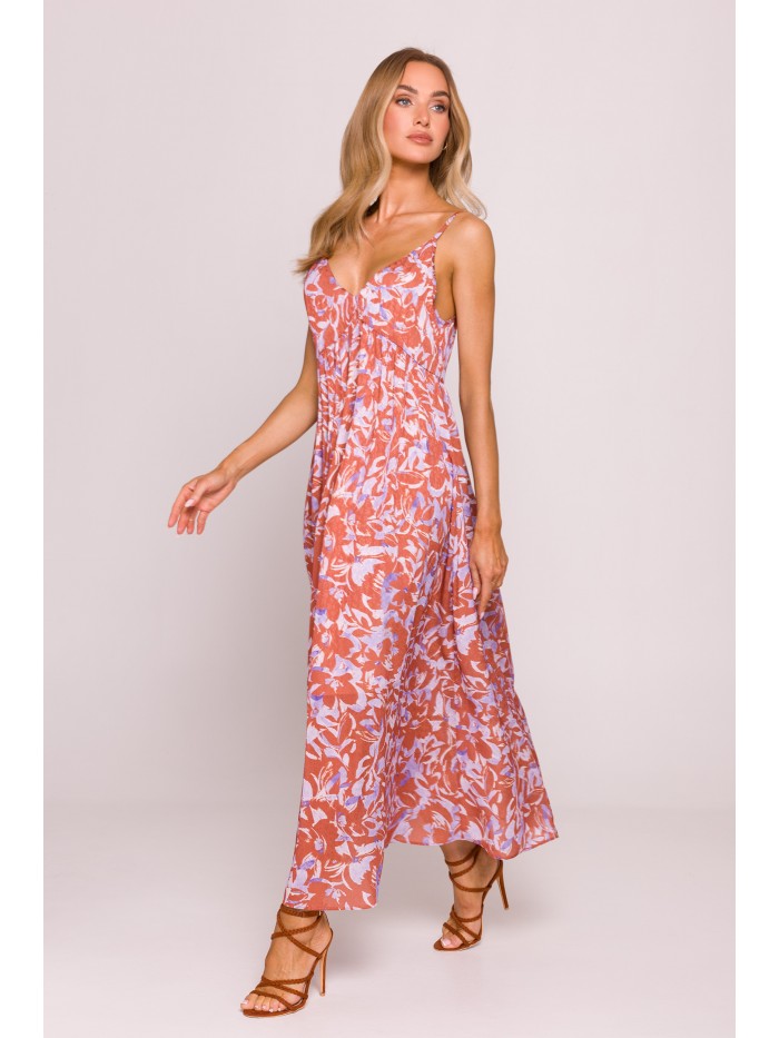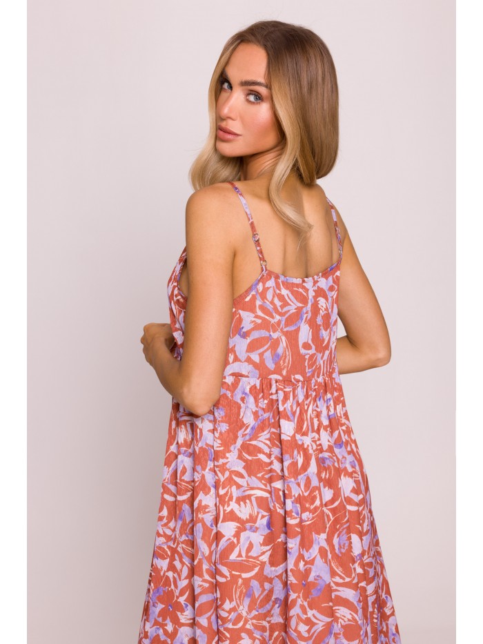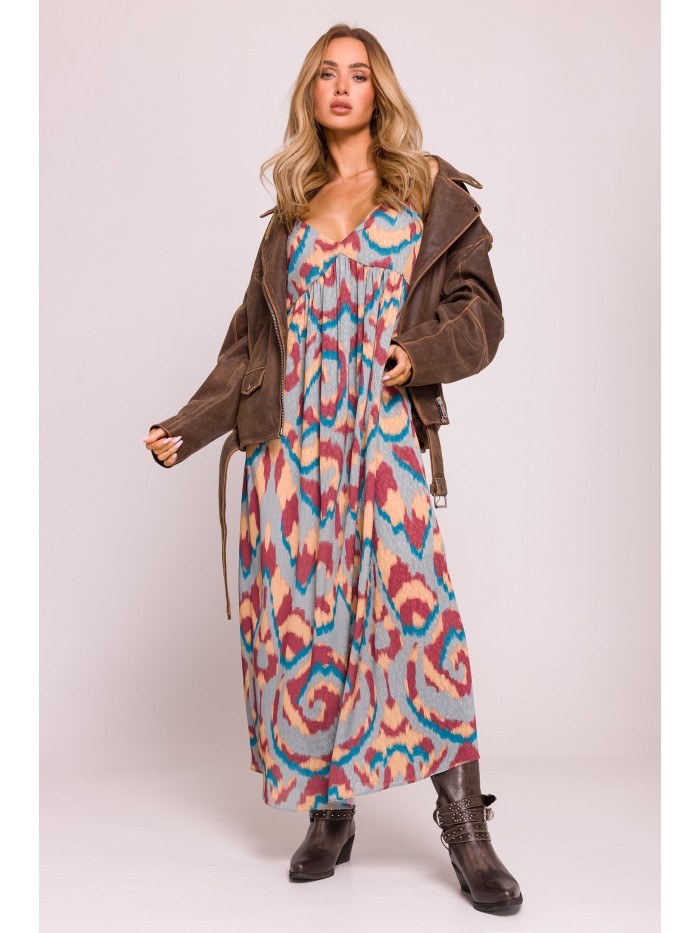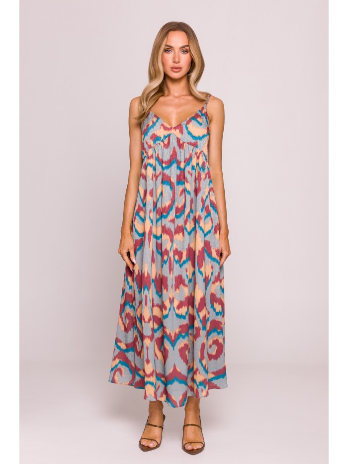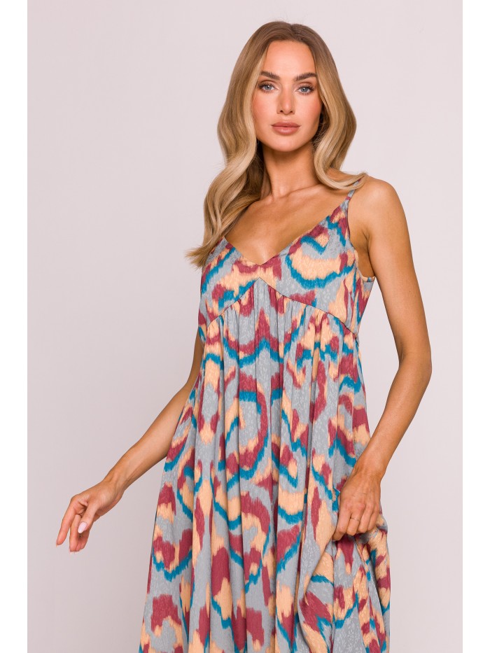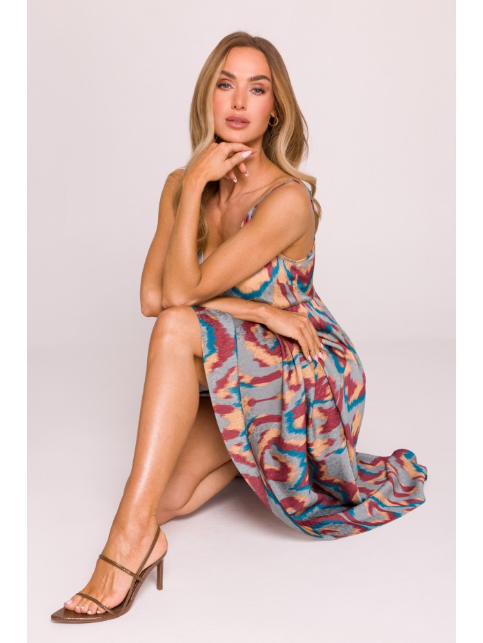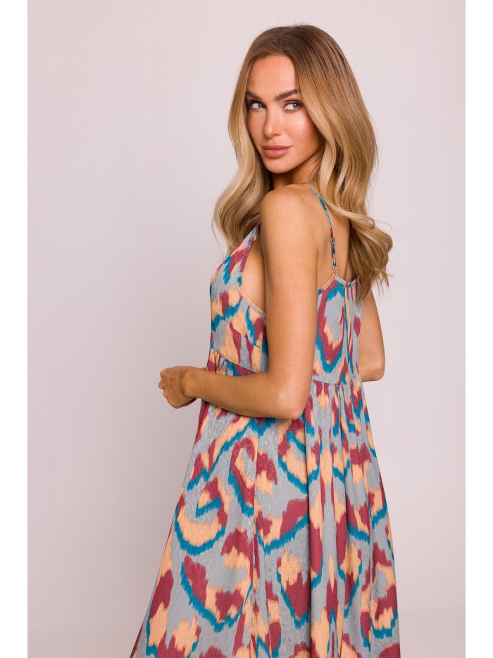 Ένα ανάλαφρο και θηλυκό φόρεμα , φτιαγμένο από ευαίσθητο jacquard ύφασμα με πολύχρωμο print που το καθιστά ιδανικό για καλοκαιρινές βόλτες, διακοπές ή πάρτι .