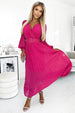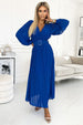 L'encolure et les manches longues aux plis subtils ajoutent une touche de luxe, tandis que la ceinture à la taille accentue magnifiquement la silhouette.