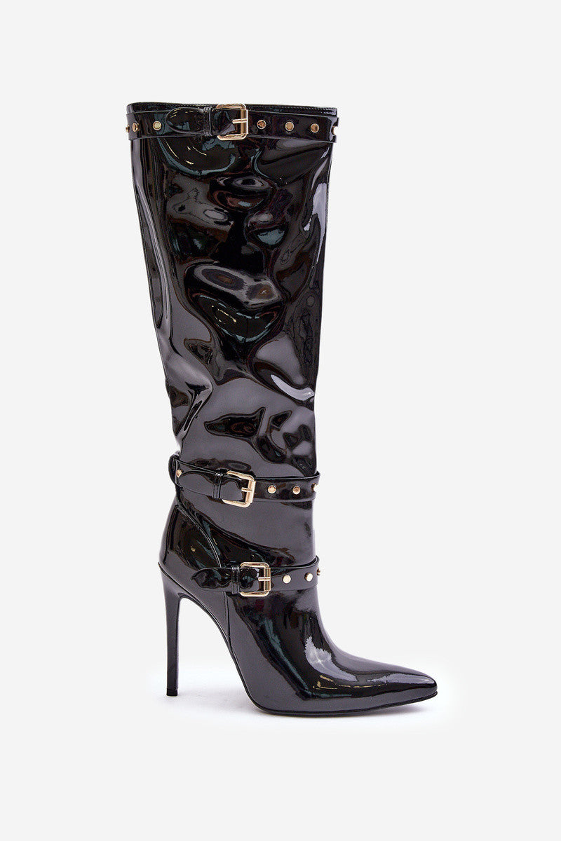 Bottes élégantes à talons aiguilles pour femmes en éco-cuir laqué, qui impressionnent par leur design élégant et leur finition soignée.