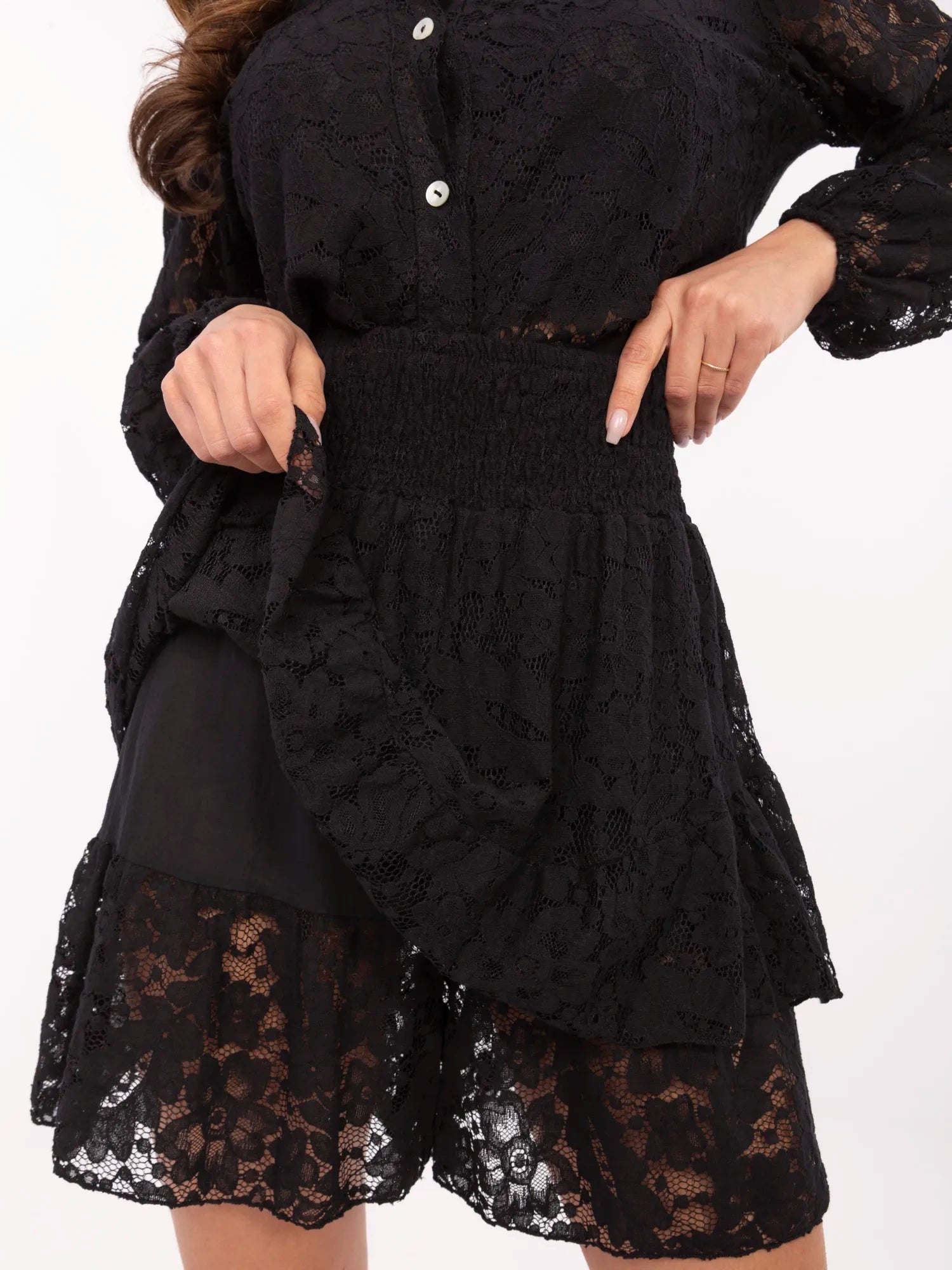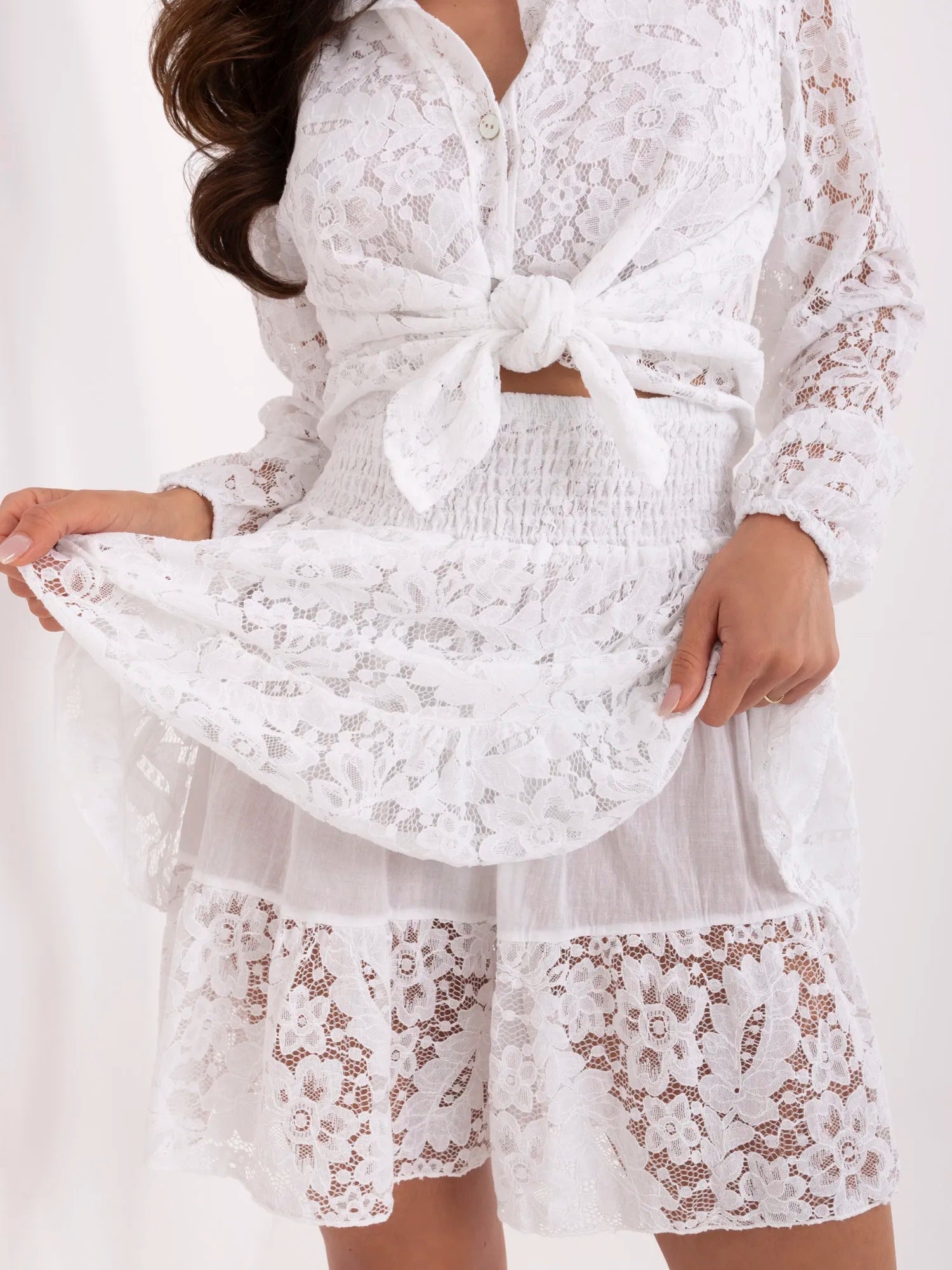 Οι λεπτομέρειες από το δαντέλα του δίνουν μια ρομαντική, κομψή πινελιά, ενώ το σύνολο ολοκληρώνεται με ένα υπέροχο σορτς-φούστα που διαθέτει βολάν , ψηλόμεση εφαρμογή και άνετη ελαστική μέση .
