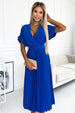 Κομψό πλισέ midi φόρεμα με κρουαζέ ντεκολτέ, κοντά μανίκια και φαρδιά ζώνη που τονίζει τη μέση.